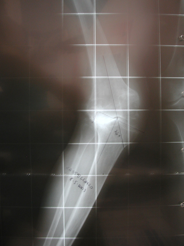 Fig. 1 radiografia preoperatoria che dimostra una deviazione in valgo di circa 40° del ginocchio destro con grave perdita di sostanza ossea del piatto tibiale laterale
